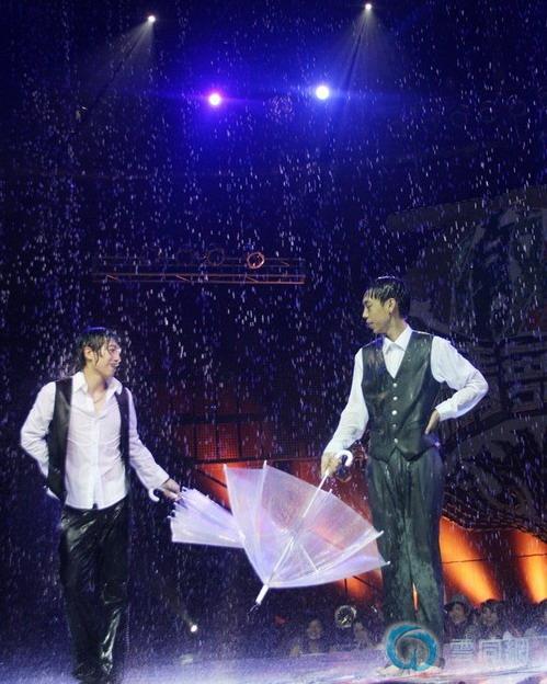 激浪精舞门大型舞蹈擂台赛即将进入大决战,本期4进3淘汰赛以“演绎经典”为主题,百分之舞表演的是电影《雨中曲》中经典的舞蹈片段,为求效果真实还特意在罐中来了一场人工降雨,表演结束后浑身湿透的两人搞起恶作剧,向主持人吴大维身上使劲甩水,这一举动却另台下粉丝尖叫不断。