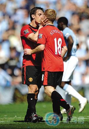 曼联球员场上演"断背" 内维尔激吻斯科尔斯(图)