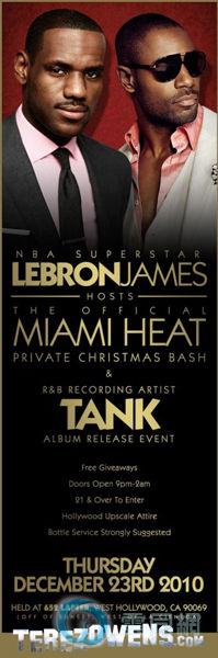 宣称海报上印有詹姆斯的头像,写着:NBA超级巨星勒布朗-詹姆斯举办迈阿密热火官方的私人圣诞狂欢派对,暨R&B歌手Tank的新专辑发布会。有免费赠品;开门时间为晚上9点-凌晨2点;好莱坞上流人士盛装出席;强烈推荐酒水服务;星期四,2010年12月23日。