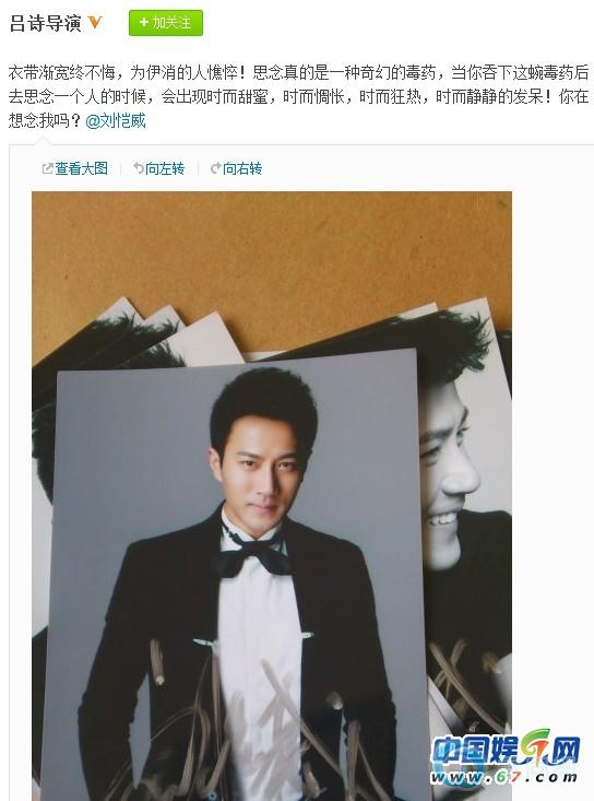 CCTV青歌赛编导、大型文艺晚会总导演吕诗在其个人微博上接连发出疑似「肉麻表白」刘恺威的文字,其中包括「和你亲密相处,让我回味久远,你的一举一动,一颦一笑紧扣我的心弦。。。我将顺应天意,将你放在心里捧在手里!我喜欢看你面带微笑的眼神,我喜欢你静静注视我的目光」等令人遐想连篇的字句。