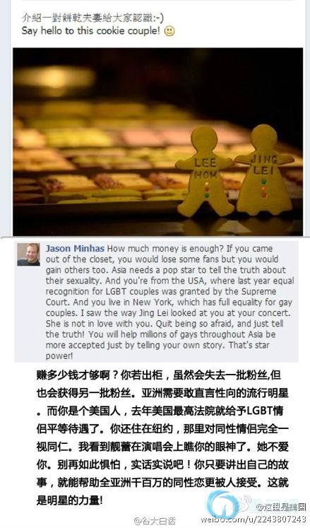 以下为外国男粉丝劝言:“赚多少钱才够啊?你若出柜,虽然会失去一批粉丝,但也会获得另外一批粉丝,亚洲需要敢直言性取向的流行明星,而你是美国人,去年美国最高法院给予LGBT情侣平等待遇了。你还住在纽约,那里对同性情侣完全一视同仁。我看到靓蕾在演唱会上瞧你的眼神了,她不爱你。别再如此惧怕,实话实说吧!你只要讲出自己的故事,就能帮助全亚洲千百万的同性恋更被人接受,这就是明星的力量!”