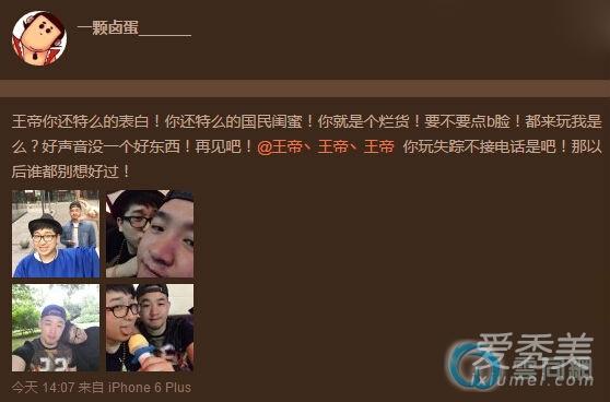 据了解,王帝是《中国好声音》第四季哈林组学员,在比赛盲选时,曾凭借一曲《别找我麻烦》,获得导师转身,因在节目中自曝帮闺蜜打跑小三,而获封“中国好闺蜜”的他,却李代沫同性密友发文怒斥,“王帝你还特么的表白!你还特么的国民闺蜜!你就是个烂货!要不要点b脸!都来玩我是么?好声音没一个好东西!再见吧!王帝你玩失踪不接电话是吧!那以后谁都别想好过!”他还曝出了自己与王帝的多张亲密合影,随后,多个知名大号转发了这条微博。