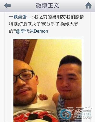 9月12日晚,多位知名大号爆料,称李代沫同性密友发文怒斥同性男友是渣男,不接电话玩失踪,他还在文中怒斥“好声音没一个好东西”,并曝光了两人的亲密照,同时他还向同性男友放话“谁都别想好过”,据悉,李代沫同性密友所指的人,正是《中国好声音》第四季哈林组学员王帝。