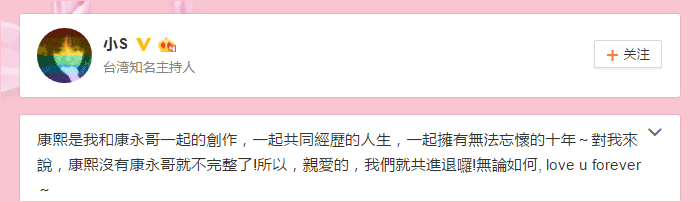 仅仅十分钟后,搭档小S也通过微博表态,要与蔡康永同进退。“康熙是我和康永哥一起的创作,一起共同经历的人生,一起拥有无法忘怀的十年。对我来说,康熙没有康永哥就不完整了!所以,亲爱的,我们就共进退啰!无论如何,love u forever。”