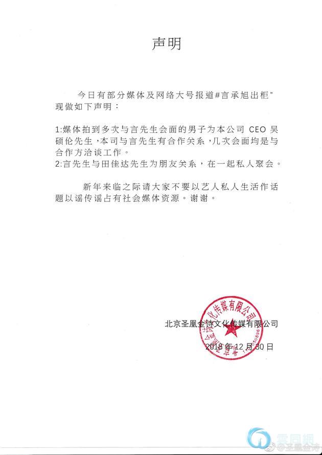 新浪娱乐讯:12月30日有媒体拍到言承旭[微博]与男星田家达[微博]在酒店同住5天,指他们小心避嫌,没有一起出门,连叫外卖都一次只买一人份。30日晚,言承旭方发表声明,称媒体拍到多次与言承旭会面的男子为北京圣凰金诗文化传媒公司CEO吴硕伦先生,几次见面都是洽谈工作。而言承旭与田家达为朋友关系,在一起属私人聚会。早前,田家达经纪人回应:“他们在北京是室友关系。”强调两人住的是独栋大楼不是酒店。