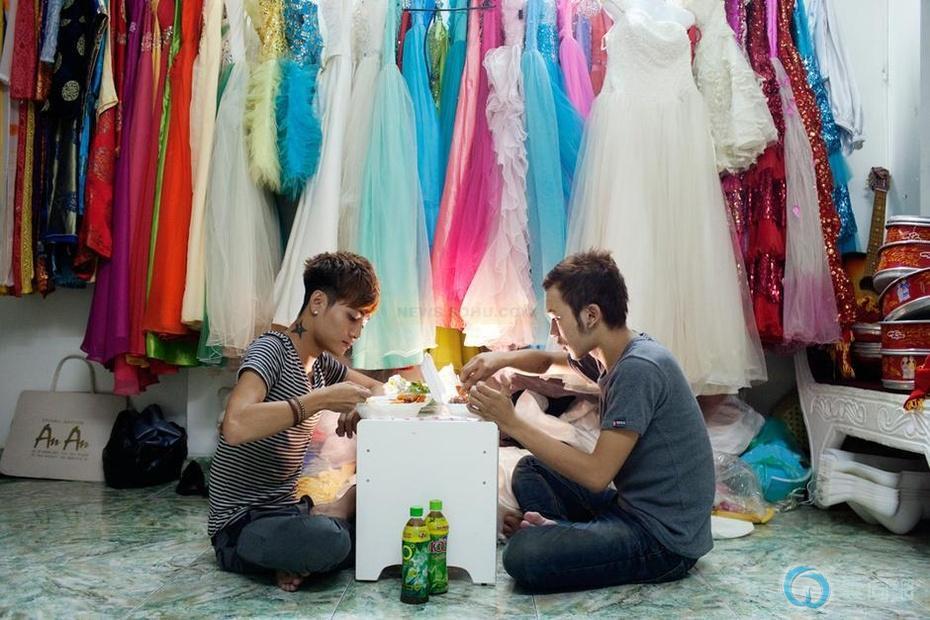 Thien (28岁,化妆师) 和 Vuong (20岁,化妆师) 他们一起工作的婚纱影楼里吃午饭。他们在一起1年了。