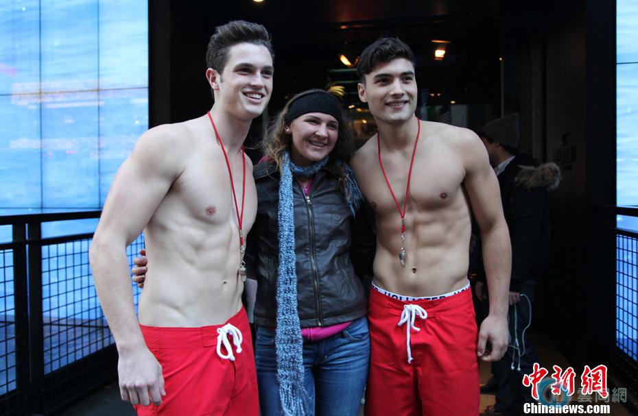 11月29日,“黑色星期五”当日,纽约市第五大道的一家商店外面,两位销售人员不畏低温严寒“裸身”迎客。当地纽约最低气温已跌至零下。图为顾客与两位门店销售人员兴奋合影。