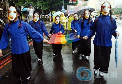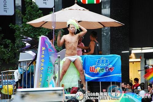 鼓吹素食主义的“素食男儿”,打出“给我男体,不要尸体”口号,连推车都是回收纸箱制成,环保做得很彻底;二度上街的“Bi the Way”标语“我们是双性恋”写得斗大,姿态比去年更突出;压轴的男同志游泳队“水男孩”也依然广获喝采掌声。