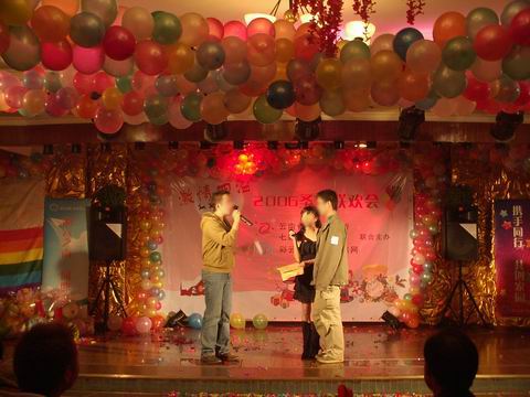 晚会伊始,进入现场的朋友就发现得到一个印有云同标志的号码标贴,每人一号。这是晚上特别设计的一个环节。每个人的这个号码可以便于参加游戏,更便于陌生的同志朋友们的相互交流和认识,最后更有晚会的抽奖等着大家。同时晚会还设立了一个签名的标语横幅,每位来宾和朋友可以在上面抒发感想,为明天许下美好愿望。