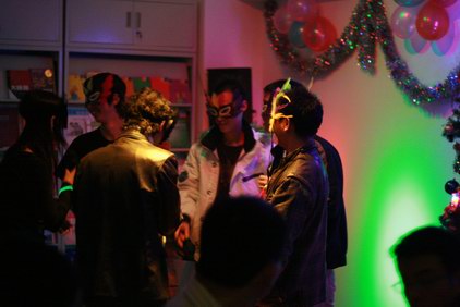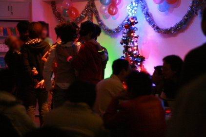 还在大厦门口,就有手持彩虹旗的志愿者迎接,并给每位朋友戴上荧光棒做的手环。进入休闲吧,“美丽的天使”和“可爱的圣诞老人”热情地招待着大家,并给朋友们送上漂亮的面具和饮品。伴随着温馨的灯光和欢快的节奏,大家相互认识,互相交流,欢声笑语,彼此间没有了距离和隔阂,充满了温暖和融洽。