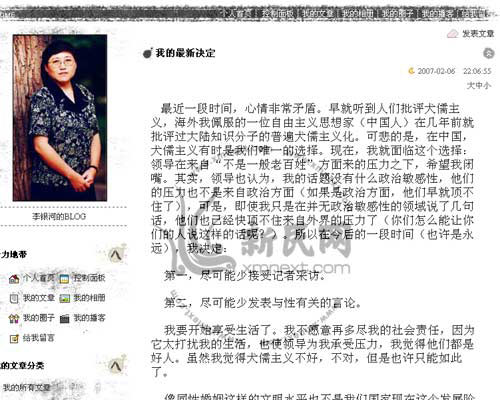 日前(2月6日)李银河在自己的博客中发布了一篇题为《我的最新决定》的日志,表示由于自己的领导受到“来自不是一般老百姓”的压力,而不得不“闭嘴”。于是,在今后的一段时间,李银河决定:“第一,尽可能少接受记者采访;第二,尽可能少发表与性有关的言论。”