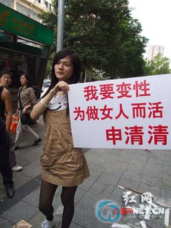 此时,申清清高举一广告牌称“我要变性,为做女人而活”,而美代子的广告牌上则显示“死了也要变性,做一天女人也值得”,就连举牌子的姿势都“惹火撩人”,引得无数好奇的市民驻足。