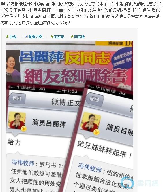 唉,台湾报纸也开始报导吕丽萍用微博鼓吹仇视同性恋的事了。吕小姐,你仇视的同性恋,并不是受伤不会痛的抽象名词,而是有血有肉的人呀!你此生合作过的剧组,提携过你的媒体,看你戏给你奖的支持者,其中多少同志对你善意成全?不管信什么教,,光从做人最根本的道理来说,鼓吹仇视这许多成全过你的人,可以吗?