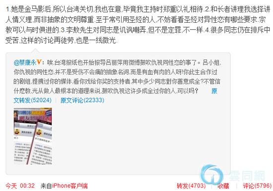 中国内地女演员吕丽萍26日转发的几条微博日志,在网络中引起轩然大波,国内多家同志组织联合呼吁抵制“孙吕”作品。著名主持人蔡康永6.29日也在微博质疑吕丽萍缺乏做人最基本的道理,此条微博被超过人五万人转发,许多明星也纷纷跟贴。6月30日凌晨蔡康永再发微博表示“很多同志仍在排斥中受苦,这样的讨论再徒劳,也是一线微光。”