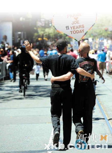国外的同性恋游行中,一对恋人大方向观众展示他们的恋爱时间。