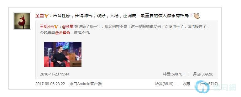 9月6日晚,金星转发王凯曾经做客《金星秀》的微博,并称赞王凯道:“声音性感,长得帅气;戏好,人稳,还调皮…最重要的做人做事有格局!”疑似回怼靳东早前“无意接触不男不女、非爷们的人和事”的言辞。